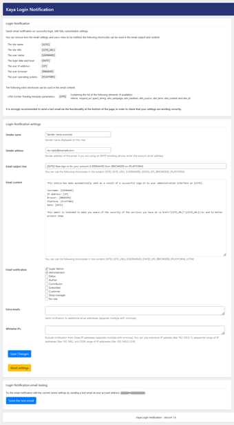 ปลั๊กอินนี้มีฟีเจอร์ต่าง ๆ เช่น การยกเว้นที่อยู่ IP เฉพาะจากการแจ้งเตือน การส่งการแจ้งเตือนไปยังที่อยู่อีเมลเพิ่มเติม และการใช้รหัสสั้นสำหรับข้อมูลการเข้าสู่ระบบที่ละเอียด ผู้ใช้สามารถปรับแต่งเนื้อหาอีเมล รวมถึงรายละเอียดผู้ส่งและการจัดรูปแบบ HTML เพื่อให้เหมาะกับความชอบของพวกเขา ที่สำคัญ Kaya Login Notification ให้ความเคารพต่อความเป็นส่วนตัวของผู้ใช้ เนื่องจากไม่เก็บรวบรวมหรือจัดเก็บข้อมูลส่วนบุคคลหรือกำหนดคุกกี้ โดยมุ่งเน้นไปที่การส่งการแจ้งเตือนการเข้าสู่ระบบตามเกณฑ์ที่ผู้ใช้กำหนดเอง